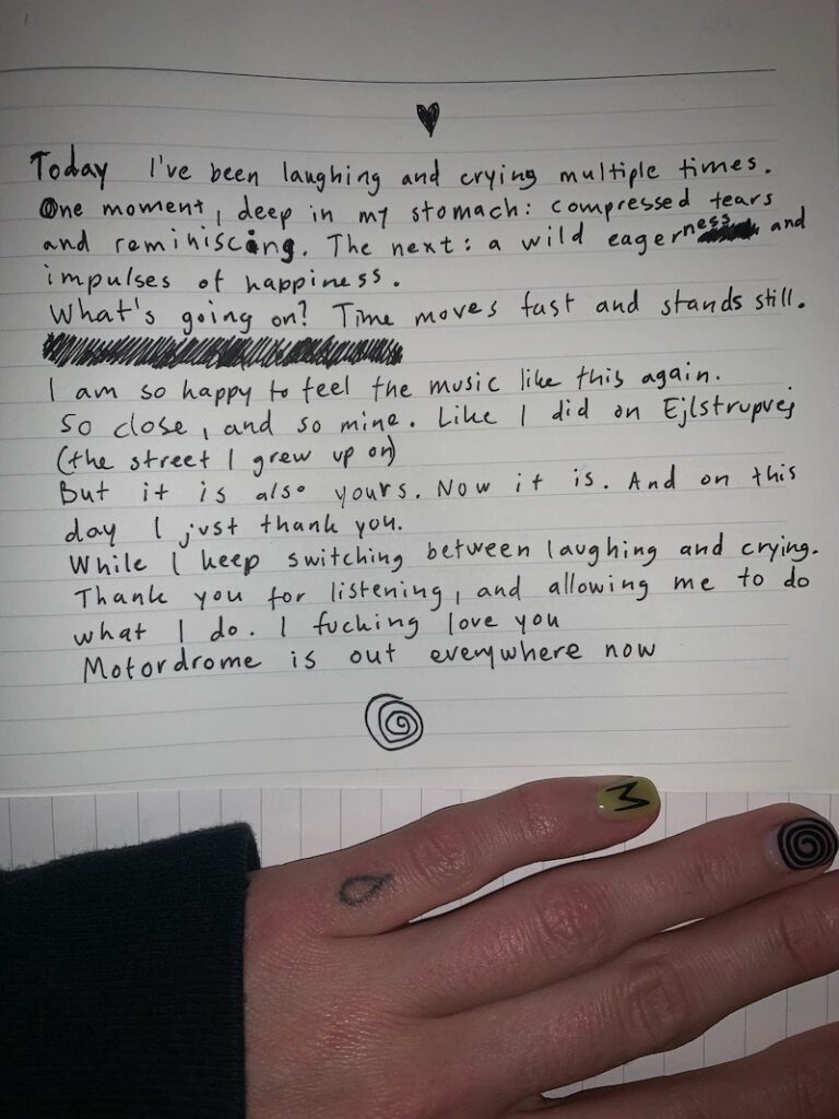 Today I’ve been laughing and crying multiple times.One moment, deep in my stomach: compressed tears and reminiscing. The next: a wild eagerness and impulses of happiness.What’s going on? Time moves fast and stands still.I am so happy to feel the music like this again.So close, and so mine. Like I did on Ejlstrupvej (the street …